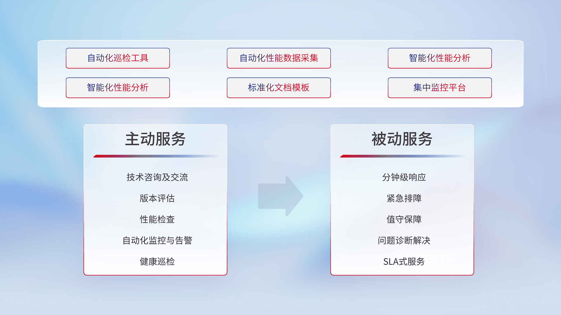 智能化工具和标准化文档,,,,保障服务质量,,,提供主动服务(包含技术咨询、、、、版本评估、、、性能检查、、自动化监控与告警、、健康巡检)和被动服务包含(分钟级响应、、、、紧急排障、、、、值守保障、、、问题诊断解决、、、、SLA服务)。。。。