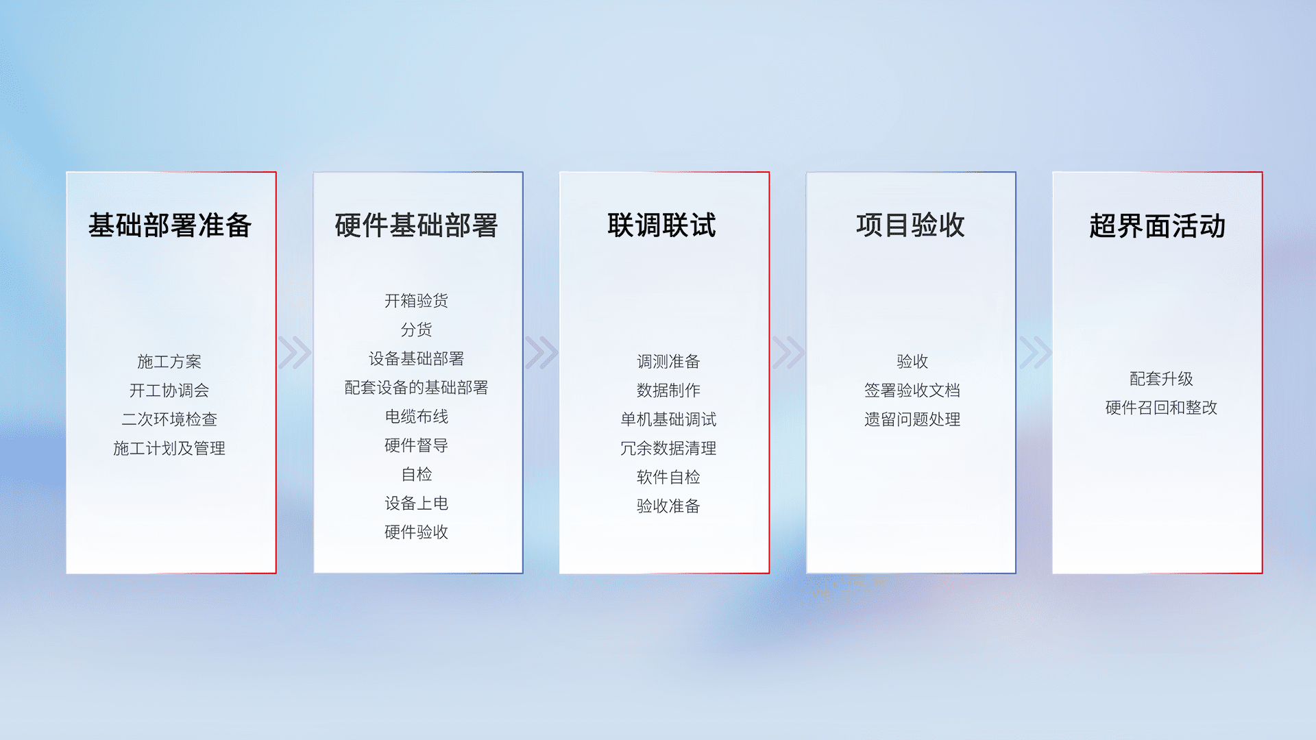 从基础部署准备、、硬件基础部署、、联调联试、、项目验收、、、越界面活动的全过程可追溯,,,保证施工质量和进度。。。。